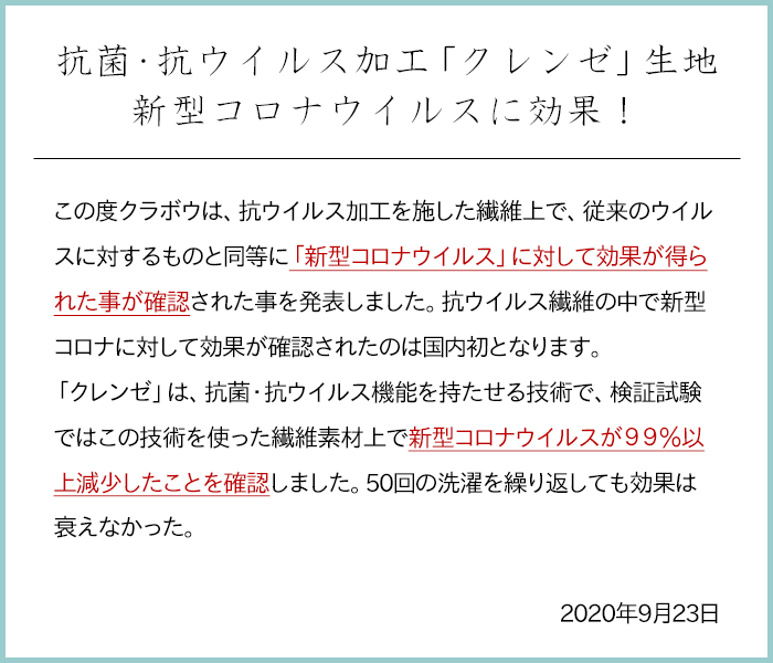 クラボウの抗菌・抗ウイルス加工繊維「クレンゼ」は、新型コロナウイルスに対しても従来のウイルスに対するものと同等に新型コロナウイルスに対して効果が得られた事が確認されております。
