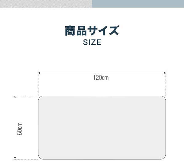 サイズ: (約)幅120cm×奥行60cm ※厚さ(約)1.5mm 材質: 軟質PVC 使用温度: (約)-10℃〜+50℃ 特記事項: ※床面の材質やコーティングの種類によっては色落ち・色移りや変色する場合がございますのでご注意ください。