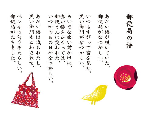 郵便局の椿、私と小鳥と鈴と、など金子みすゞの詩とデザインがひとつになって、表現されるみすゞ詩の世界観が楽しめる、折りたたみ収納できるショッピングバッグです。